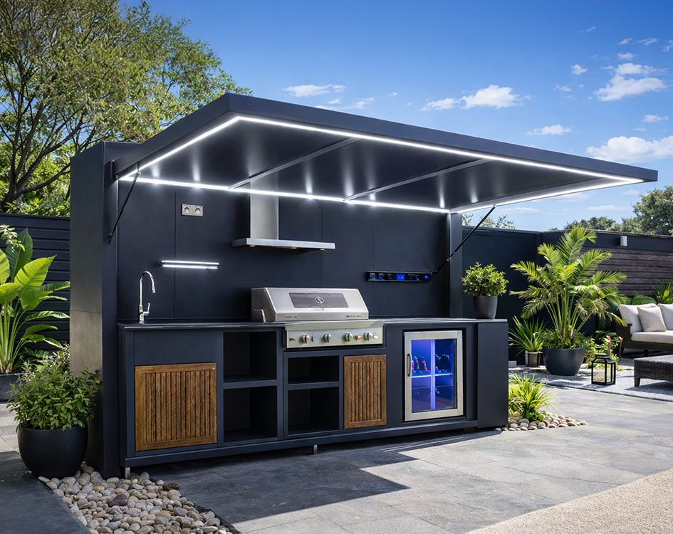 Cuisines extérieures Cuisine CASANOVA Usage : Résidentiel & professionnel SERVICES : Cuisine extérieure clé en main MATÉRIAUX : Aluminium & inox 304 Conception & équipements CUISINE EXTÉRIEURE HAUT DE GAMME – CONCEPTION & ÉQUIPEMENTS Structure monobloc autoportante en aluminium, prête à l’usage Matériaux résistants aux intempéries et à l’humidité Équipements inox professionnels intégrés Bac à charbon offert, permettant une utilisation mixte gaz / charbon pour varier les modes de cuisson et les saveurs Box et habillage intégralement en aluminium, durables et résistants aux intempéries Éclairage LED pour une utilisation de jour comme de nuit Installation simple, sans travaux lourds Présentation du produit Design & Conception La Cuisine Casanova a été conçue comme un véritable espace de vie extérieur. Son format monobloc autoportant repose sur une structure en aluminium thermolaqué , assurant stabilité, longévité et résistance en conditions extérieures. L’habillage en panneaux composites aluminium + PVC garantit une excellente durabilité face aux intempéries, aux UV et aux variations de température. Le capot supérieur basculant , réalisé en panneau PT13611 , protège efficacement le plan de travail et les équipements lorsqu’il est fermé, tout en apportant une signature esthétique forte une fois ouvert. Le plancher en aluminium finition bois vient compléter l’ensemble avec une touche chaleureuse et contemporaine. Équipements & Fonctionnalités La Cuisine Casanova est livrée entièrement équipée, conformément aux visuels présentés : Meuble évier avec évier et robinet en inox 304, intégré avec tiroir Meuble barbecue équipé d’un barbecue en inox 304SS Dimensions : L1170 × P635 × H470 mm Meuble réfrigérateur avec réfrigérateur en inox 304SS Dimensions : L430 × P465 × H680 mm Les panneaux de meubles sont réalisés en panneau composite T18 mm (aluminium + PVC) , assurant solidité et facilité d’entretien. Éclairage & Énergie La cuisine est LED intégrée offre un confort d’utilisation optimal en toutes circonstances : Bande LED intégrée au choix : Blanc chaud 3000K Blanc neutre 4000K Étagère aluminium avec bande LED intégrée (1 pièce) Prises électriques intégrées Alimentation : 220V – 50Hz (norme France) Dimensions & Informations techniques Dimensions totales : L2980 × P920 × H2400 mm Finition caisson et capot : panneau PT13611 Conditionnement : palette bois (1 pièce) Garantie & Durabilité Garantie moteur : 5 ans Garantie éclairage LED : 3 ans Conçue pour durer, la Cuisine Casanova répond aux exigences d’un usage extérieur régulier, aussi bien résidentiel que professionnel.