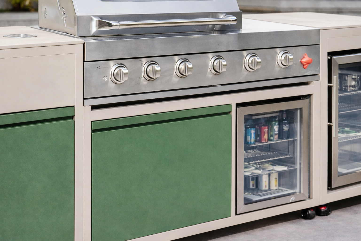 - Meuble évier avec évier et robinet en inox 304 Barbecue professionnel en inox 304SS Réfrigérateur intégré en inox 304SS Deux bacs à déchets intégrés Portes aluminium