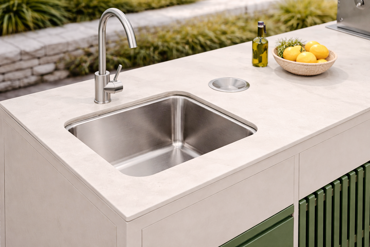 - Le plan de travail en pierre frittée apporte une finition haut de gamme, résistante à la chaleur, aux rayures et aux intempéries.